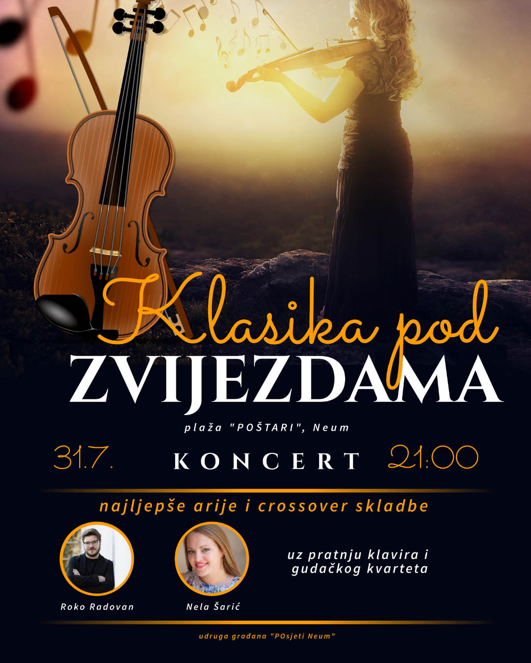 Welcome to the free concert “Classics under the Stars” and experience classical music in a modern way. Enjoy performances by soloists Roko Radovan and Nela Šarić, accompanied by a piano and string quartet.